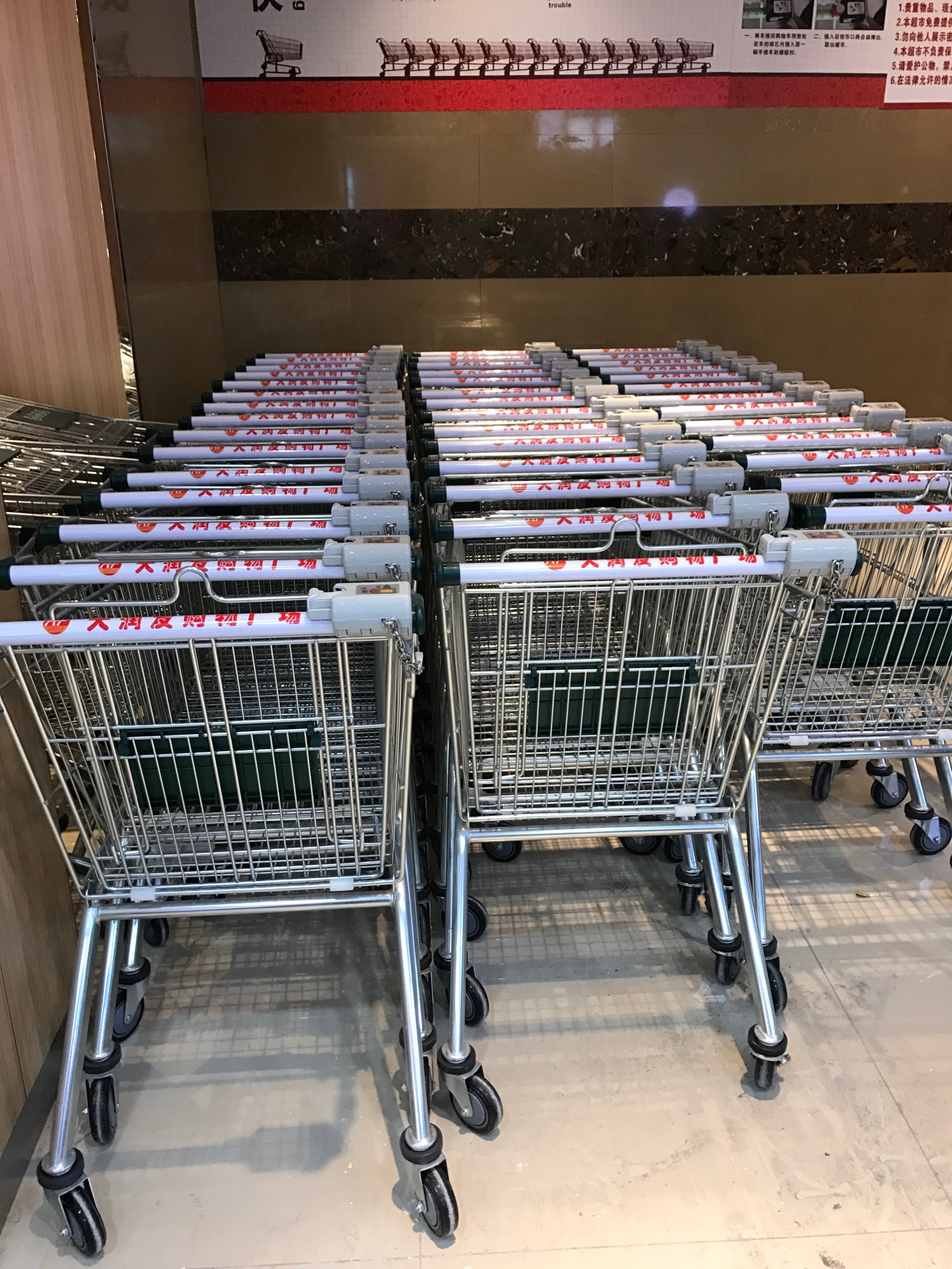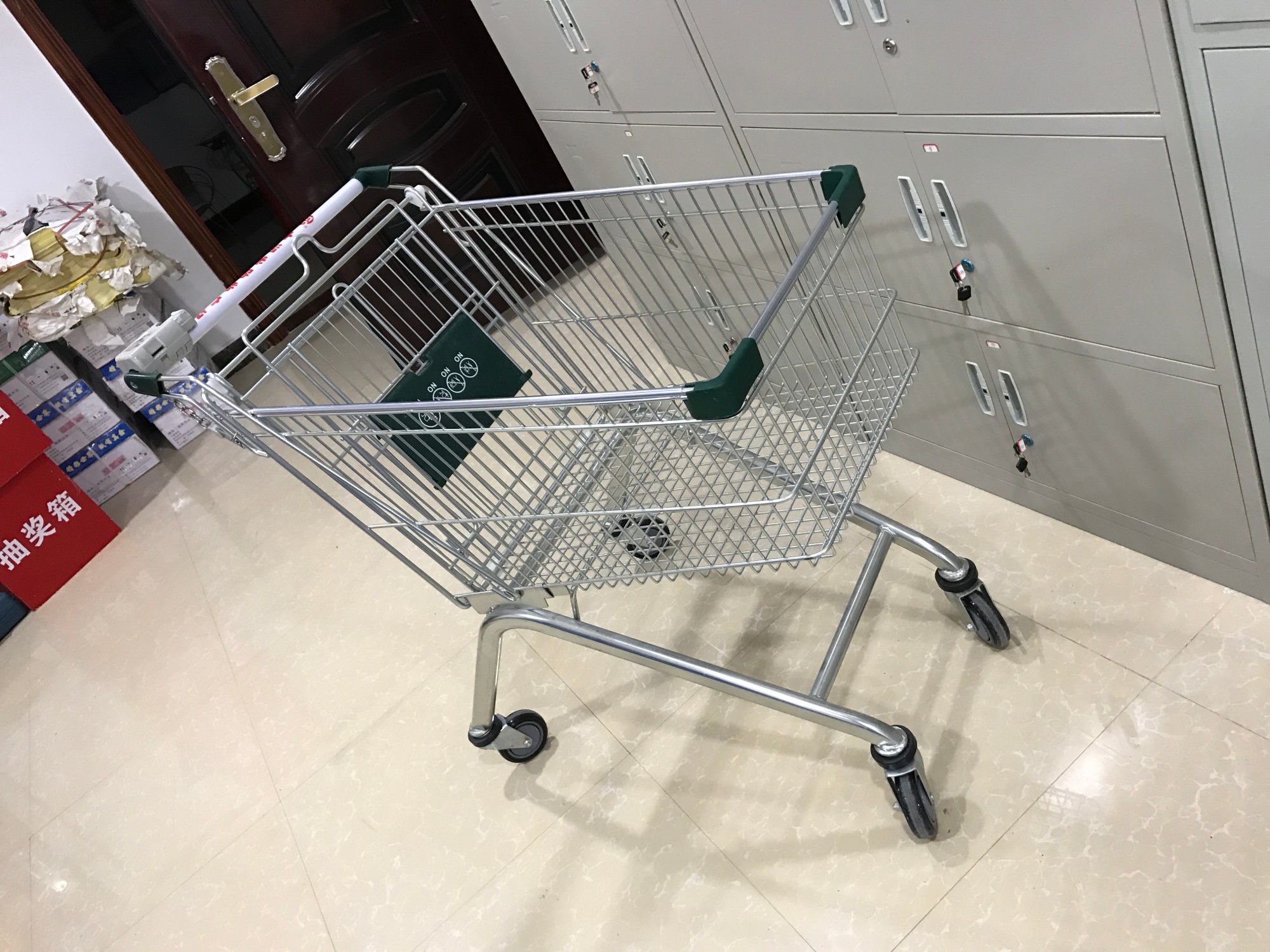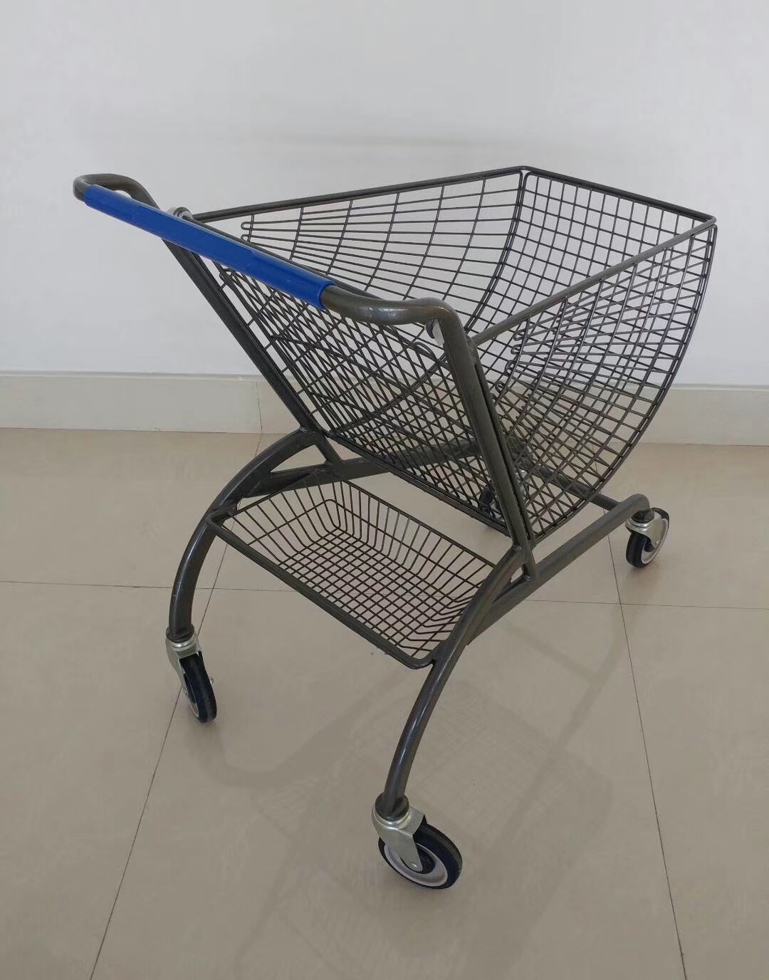 Cart: A metal or plastic cart with four small wheels that is used to carry goods while shopping (for example, in a supermarket or department store).