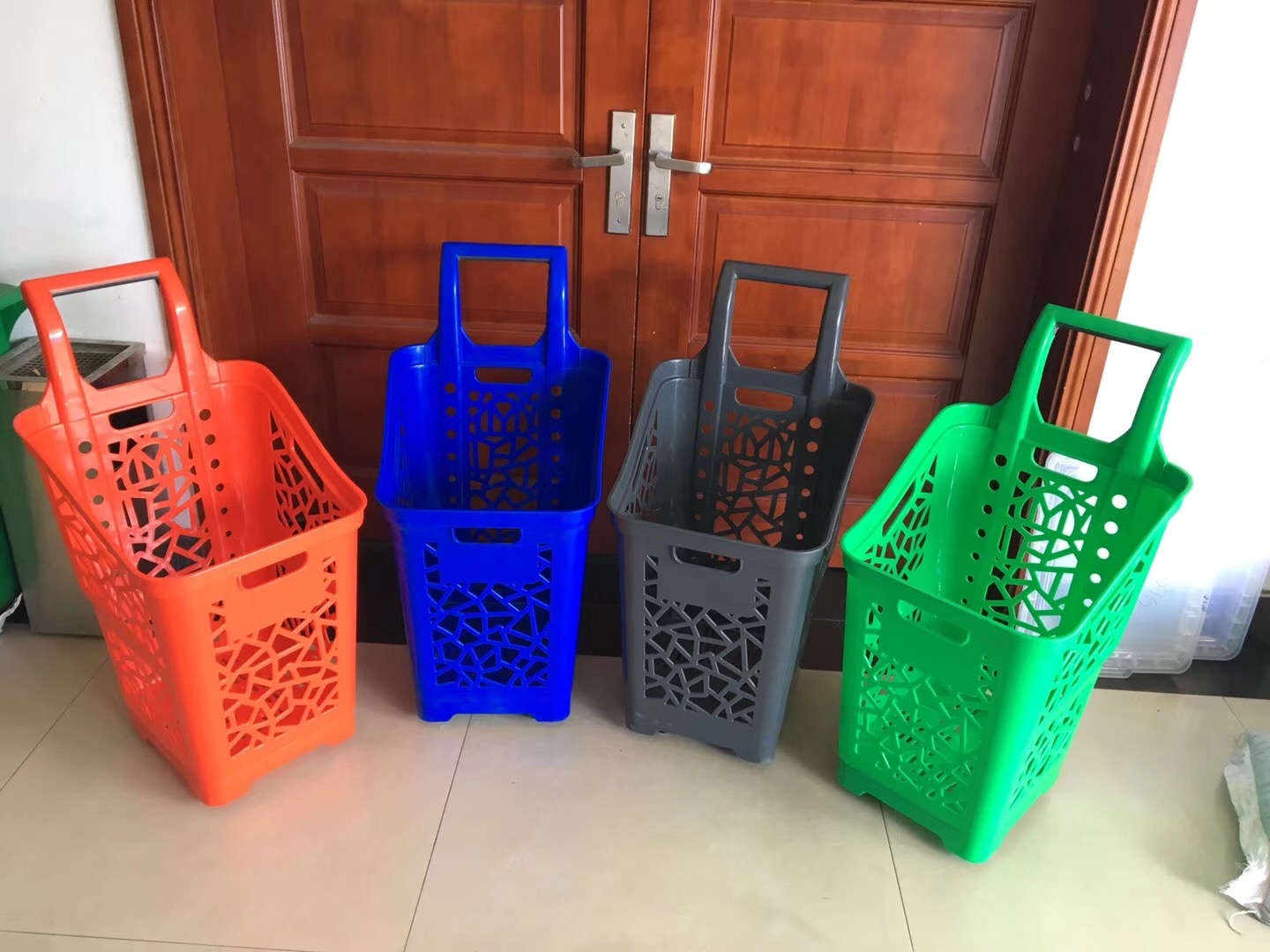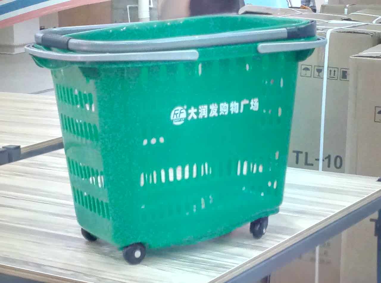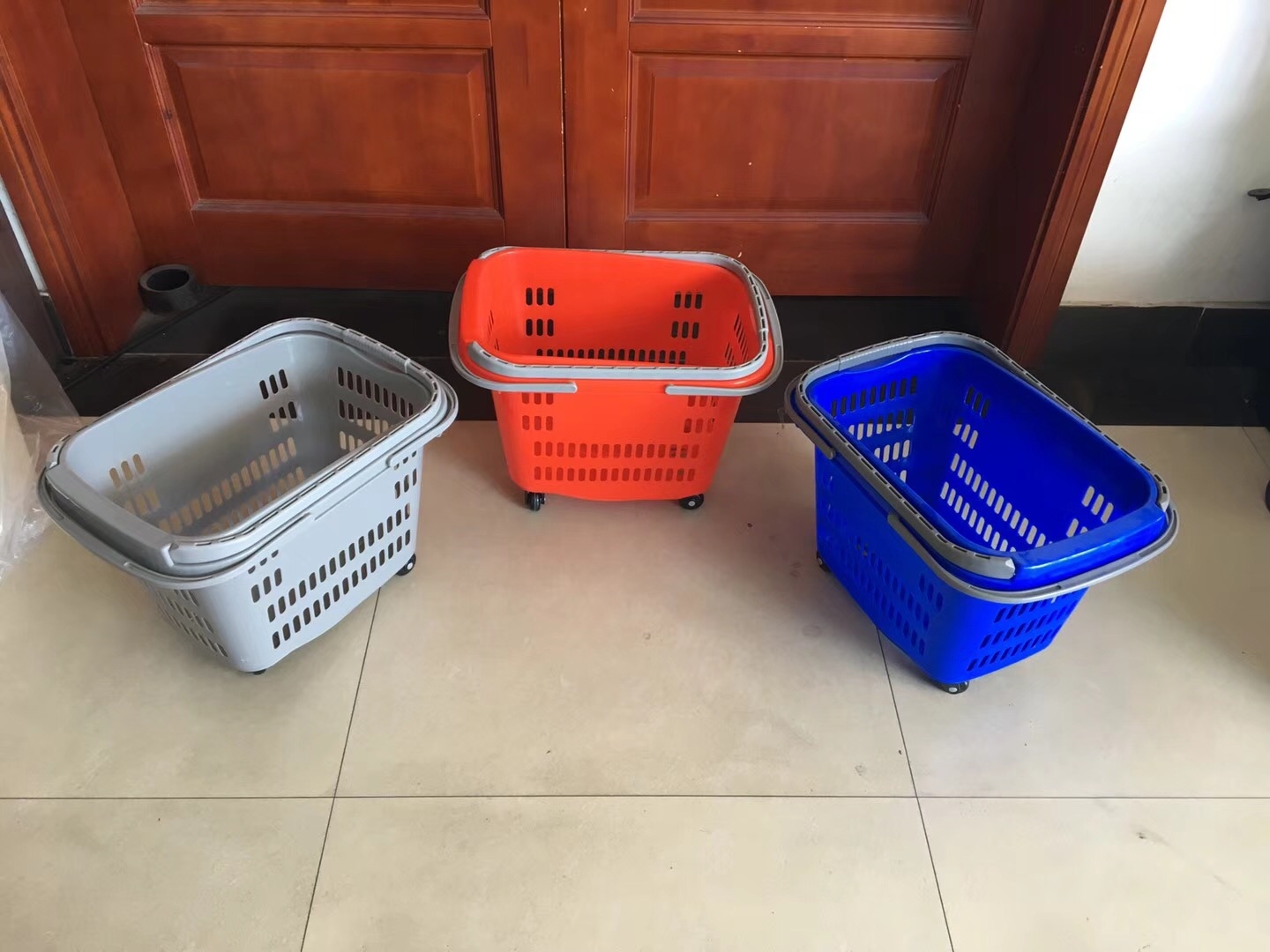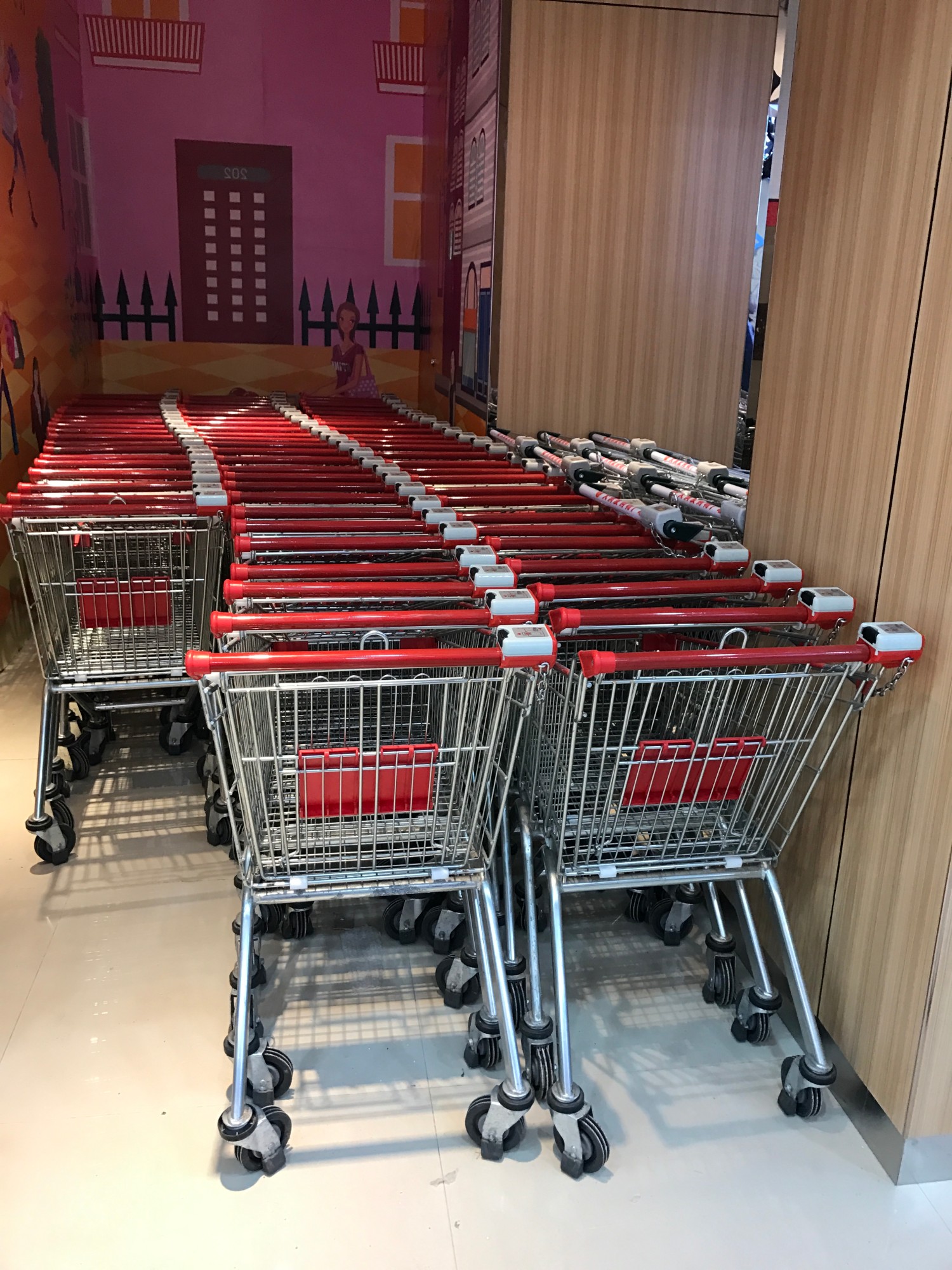Cart: A metal or plastic cart with four small wheels that is used to carry goods while shopping (for example, in a supermarket or department store).